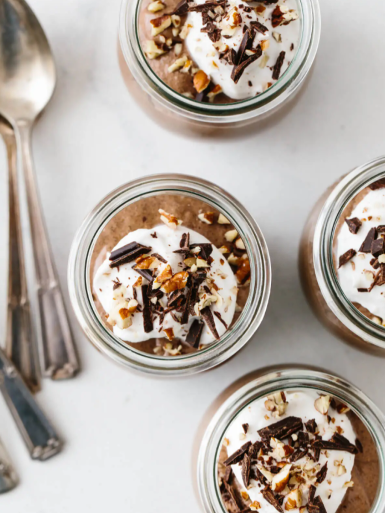 Poslužite čokoladni chia puding s gustim kokosovim mlijekom, komadićima čokolade i nasjeckanim lješnjacima