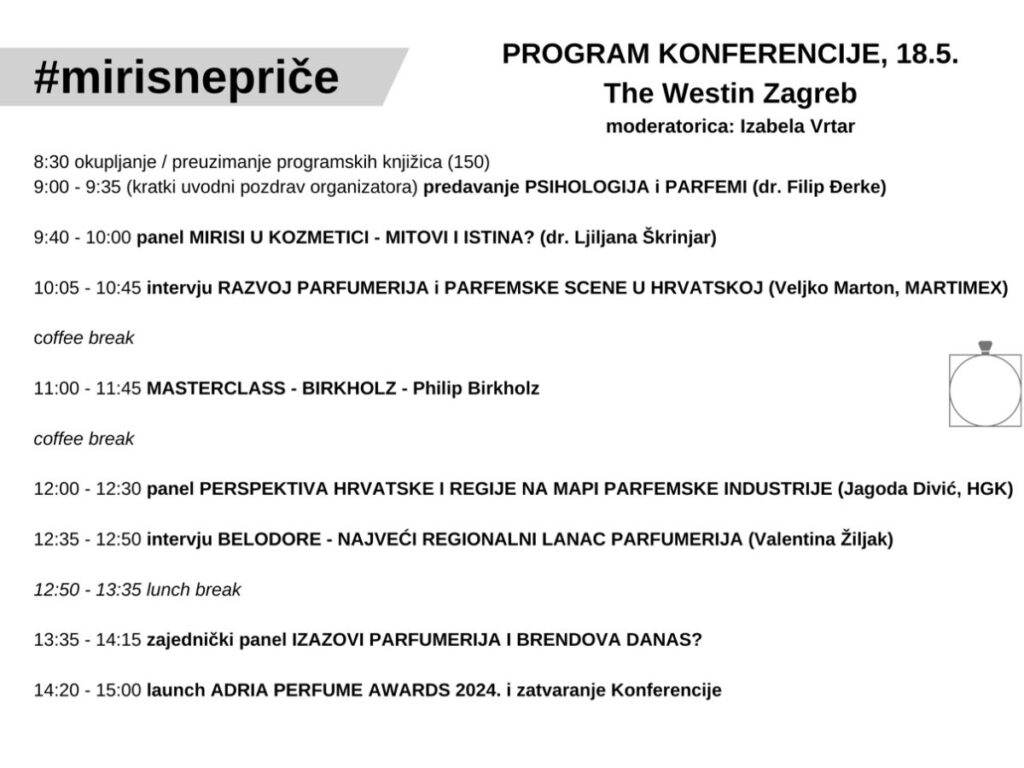 Naime, Hrvoje će sa svojim timom okupiti na pozornici stručna imena iz područja psihologije i dermatologije kao i predstavnike parfumerija i brendova kako bi publici približili mirisne teme s nekim drugačijim pogledima. Neurolog dr. Filip Đerke tako će održati predavanje na temu „psihologija i mirisi“ što će biti jedinstvena prilika da istražimo temu mozga i cijelog jednog svijeta u nama o kojem baš malo znamo. S druge pak strane, dr. Ljiljana Škrinjar kao dermatovenerolog će odgovoriti na pitanja o mirisima u kozmetici i zasigurno nas razriješiti nekih mitova. Dalje će na pozornicu doći i vlasnik parfumerije MARTIMEX, gospodin Veljko Marton koji će nam ispričati svoja jedinstvena iskustva kako se uopće parfumerijski svijet razvijao od ’90ih do danas, a biti će prilika i da gospođa Valentina Žiljak u ime BELODORE parfumerija kao najvećeg regionalnog lanca nam predstavi njihov razvojni put. Svakako će biti i zanimljiv sadržaj u suradnji s gošćom iz HGK gospođom Jagodom Divić jer će se aktualizirati pitanje regionalne perspektive na mapi parfemske industrije. Vrhunac konferencije svakako je masterclass koji će održati Philip Birkholz, a unutar kojeg će nam predstaviti niche brend BIRKHOLZ koji je trenutno jedan od najbrže rastućih parfemskih brendova u svijetu. Kroz cijelo trajanje konferencije posjetitelji će imati priliku i upoznati se s brendom JANA NAILS koji se sjajno uklapa u ovaj mirisni lifestyle, a primjer je poduzetničke priče koja inspirira i motivira.