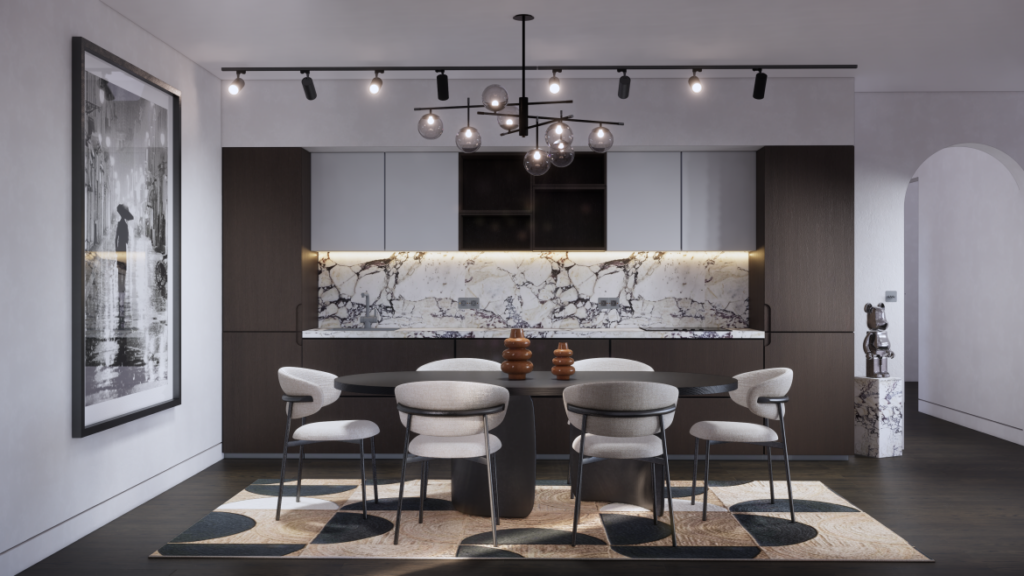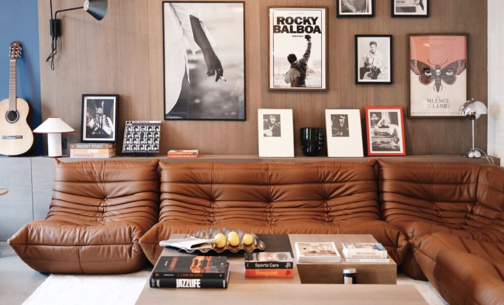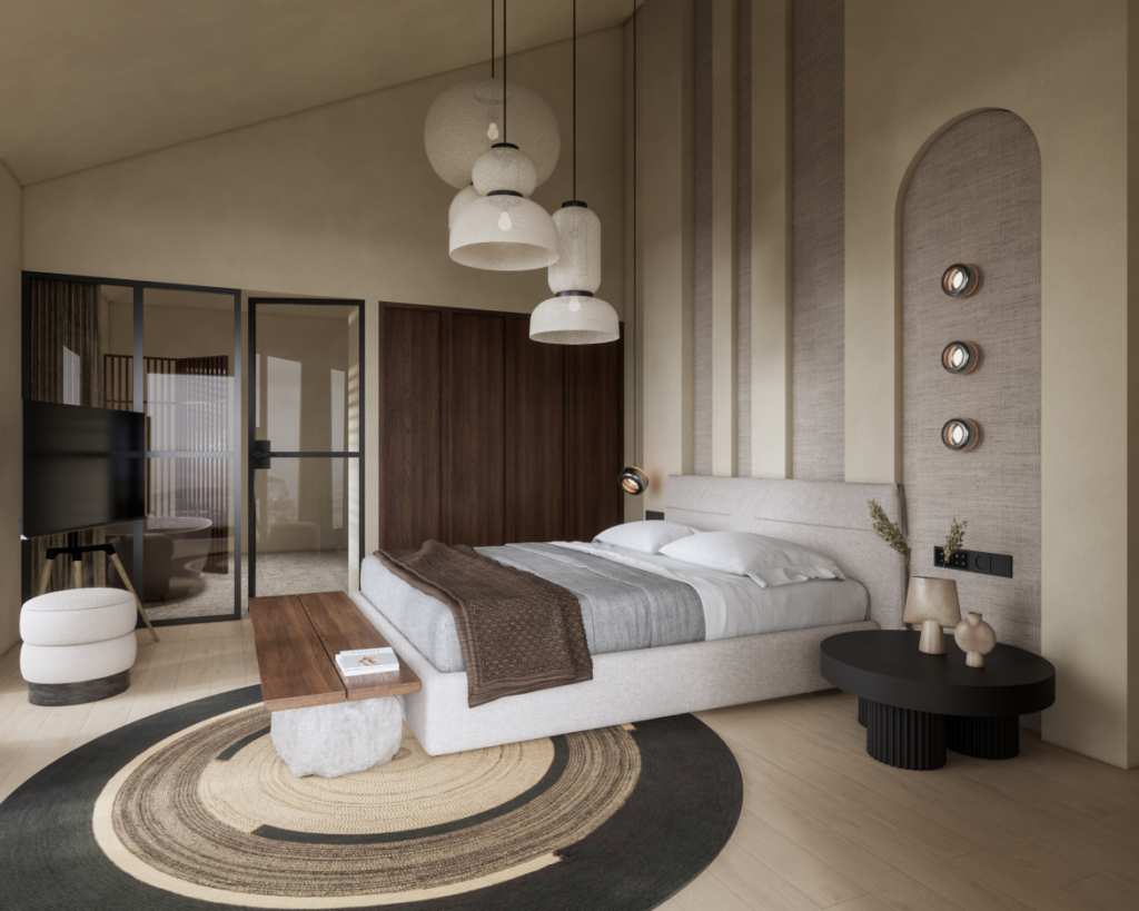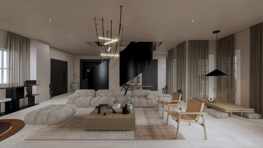 Brown Apartment je suprotnost po tonu, ali s istim osjećajem balansa. Crno-bijela baza, topli bež i smeđi tonovi stvaraju atmosferu koja podsjeća na modni editorijal.