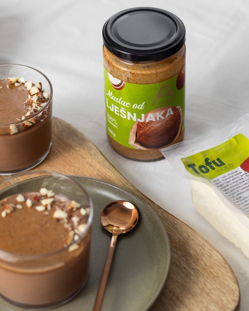 Mousse od tofua dokazuje da lagano može biti i kremasto i bogato. Ovaj desert u čaši idealan je za poslijepodne nakon napornog dana ili kao balansirani završetak večeri. „Iako se za deserte ovakvog tipa obično koristi svileni tofu, bez problema možete koristiti i klasični svježi“, objašnjava Juraj Močilac. Možda će ga biti potrebno malo duže blendati, ali rezultat je jednako gladak i svilenkast. Uz dodatak maslaca od lješnjaka i nekoliko kapi ulja naranče, desert dobiva toplu, zaokruženu aromu – savršenu za trenutke kada želimo nešto slatko, ali ne i teško.