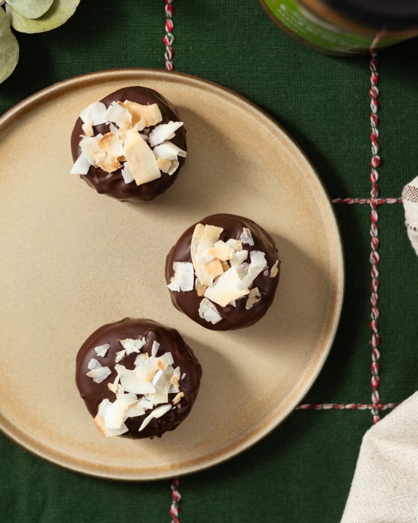 Sve sastojke, osim tamne čokolade i kokosovog čipsa, ubacite u zdjelu i sjedinite, pa rukama oblikujte kuglice ili koji već drugi oblik želite. Smjesa treba biti ljepljiva i vlažna. Ako se raspada i ne možete oblikovati lijepe kuglice, dodajte još malo maslaca od lješnjaka ili kokosovog mlijeka. Posložite na pleh za pečenje i pecite 15 – 20 min na 160° C. Izvadite iz pećnice i pustite da se skroz ohlade. Tamnu čokoladu otopite na pari i prelijte preko kolačića. Dok se čokolada još nije stisnula, pospite kokosovim čipsom. Želite li se poigrati vizualnim dojmom, isprobajte i preljev od bijele čokolade.