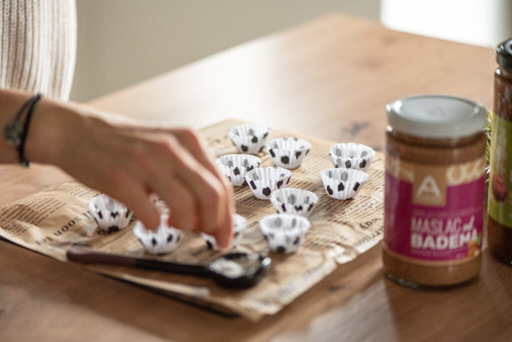Otopi se čokolada, ulije se tanki sloj u mini košarice ili kalupiće. Stavi u zamrzivač 5 minuta da se stvrdne. Zatim se napuni u sredini maslacem od orašastih plodova, prelije ostatkom otopljene čokolade i na vrh pospe cvijet soli. Ostavi se na hlađenje još dodatnih 10-15 minuta. Rezultat? Mini praline koje izgledaju kao iz fine slastičarnice.