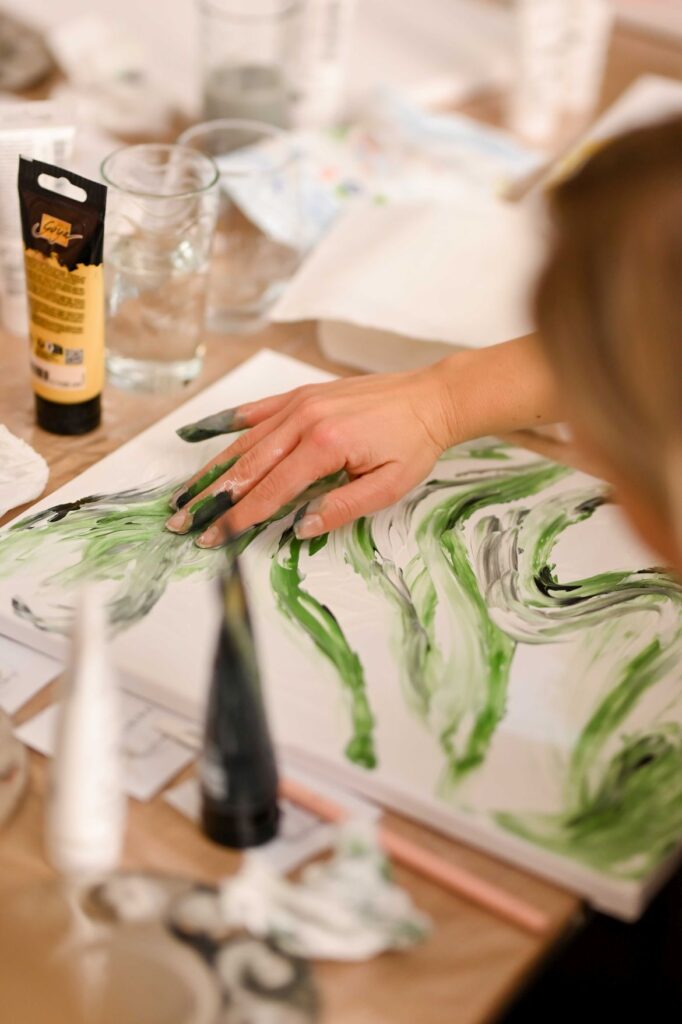 Radionica je započela vođenom meditacijom, tihim vraćanjem u tijelo i dah, a zatim su nas mirisi eteričnih ulja poveli u osobni, intimni dijalog s emocijama. Kada sam posegnula za bojama, nisam slikala kistom – već prstima.