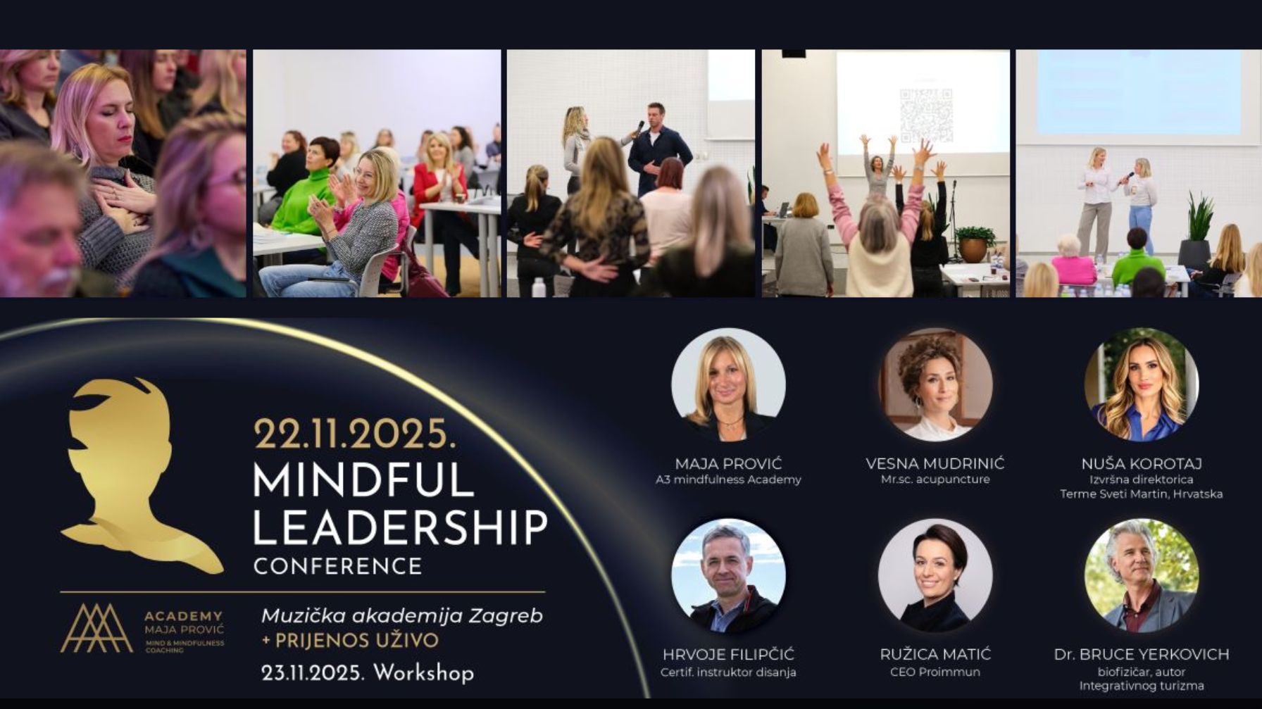 Mindful Leadership konferencija održat će se 22 i 23.11.2025. u Muzičkoj akademiji Zagreb. Organizatori ove konferencije su Maja Prović, mind & mindfulness trener, poduzetnica s 30 godina korporativne i manadžerske karijere te Una- Matea Rukavina, event manager.