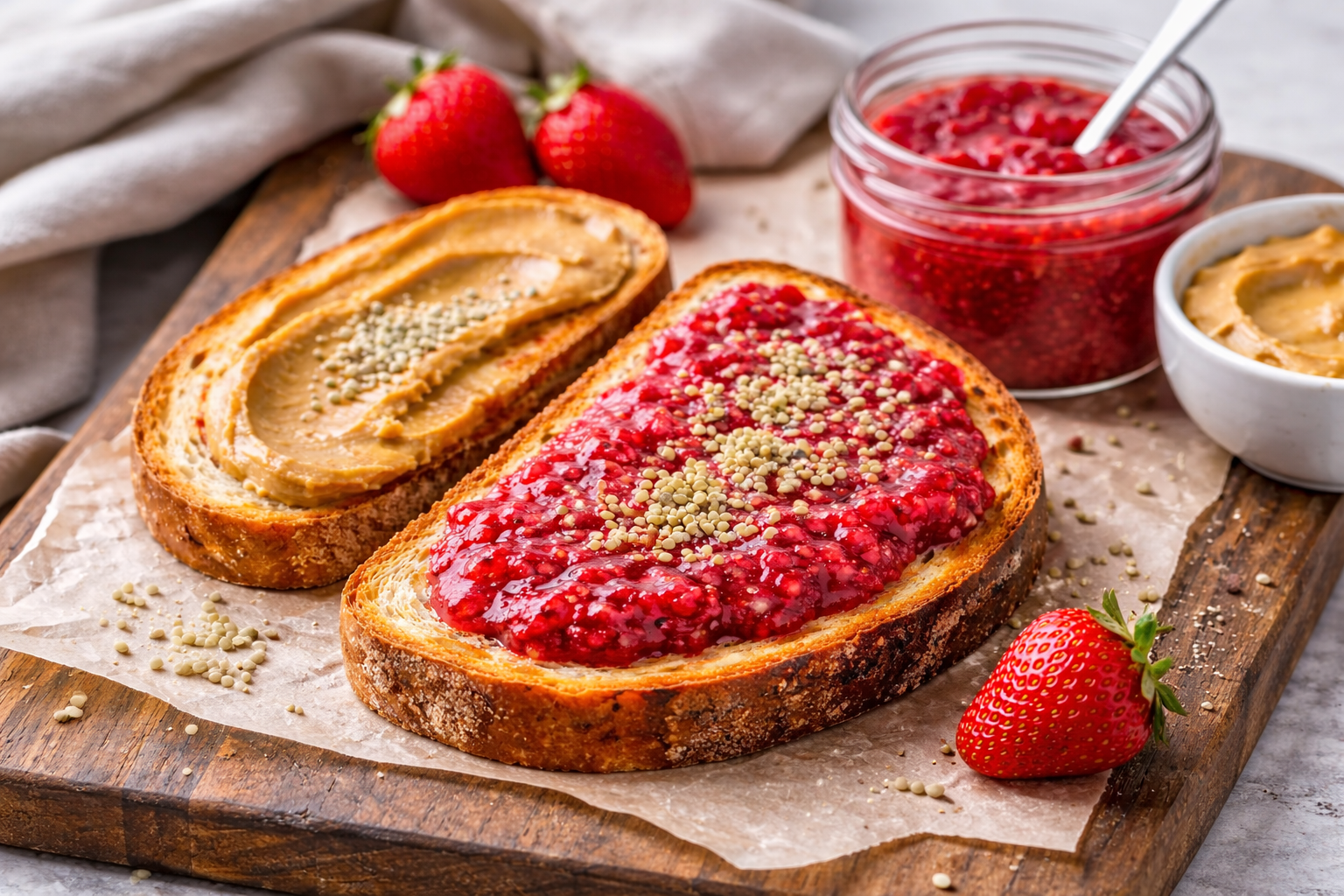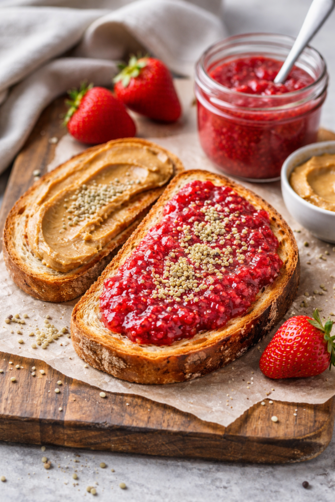 Ovo nije još jedan sendvič iz pekare, nego mali jutarnji ritual koji ozbiljno radi za tvoje tijelo. Na kruhu od kiselog tijesta spajamo tri saveznika stabilne energije: džem od chije, maslac od kikirikija i sjemenke konoplje.