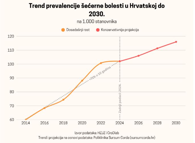 Prema analizi Poliklinike Sursum Corda, u samo deset godina broj osoba sa šećernom bolešću na 1.000 stanovnika gotovo se udvostručio, a ako se sadašnji trend nastavi, do 2030. godine Hrvatska bi mogla imati više od 500.000 registriranih dijabetičara.