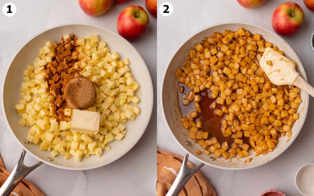 U većem loncu pomiješaj narezane jabuke, smeđi šećer, malo veganskog maslaca, limunov sok i cimet. Najprije sve kratko zagrij na jačoj vatri dok se maslac ne otopi, zatim smanji temperaturu i pusti da jabuke lagano omekšaju i puste sok.