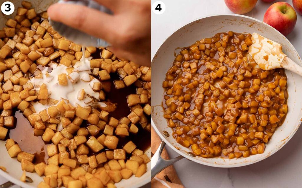 U šalici izmiješaj škrob s malo vode da dobiješ glatku “kašicu” bez grudica, pa je ulij u smjesu jabuka uz miješanje. Kuhaj još nekoliko minuta, dok nadjev ne postane gušći i sjajan. Želiš da bude dovoljno gust da ostane unutra kad zagrizeš, ali ne suh.