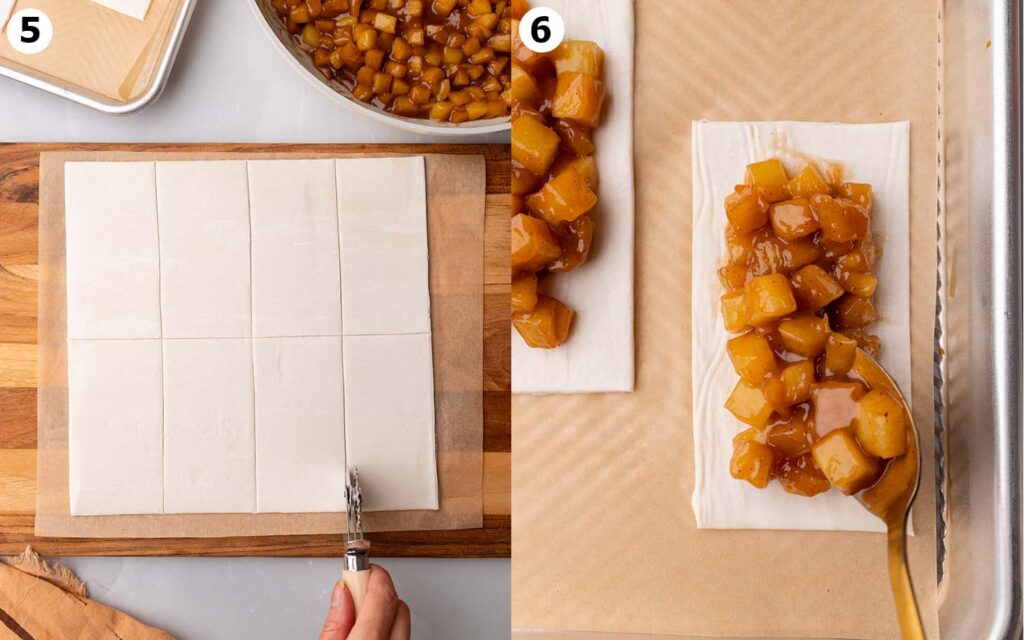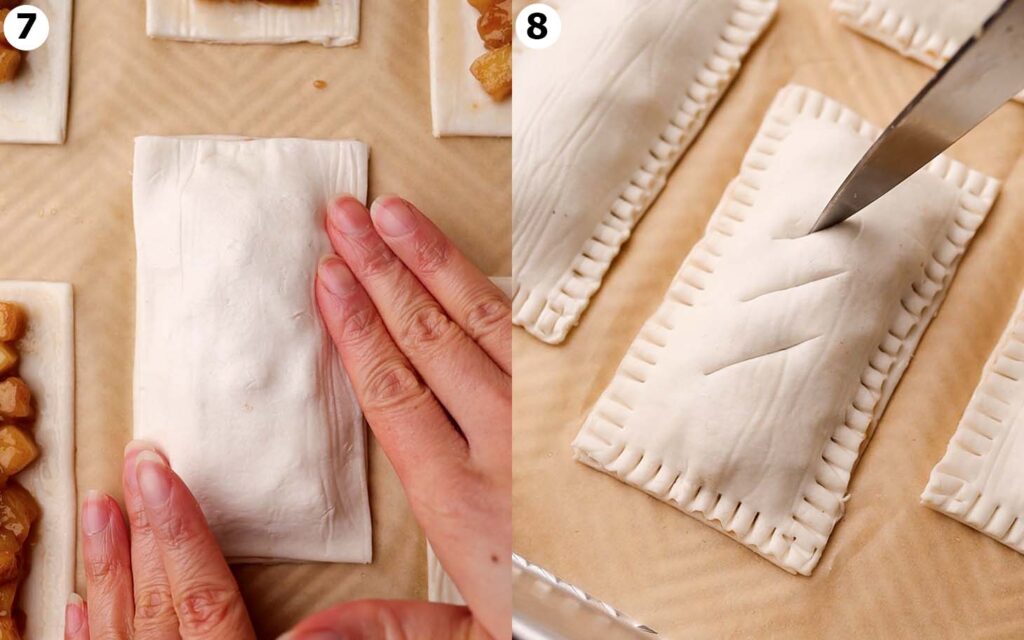 Rubove pravokutnika lagano premaži javorovim sirupom, pa preko svakog nadjeva položi drugi komad lisnatog tijesta. Prstima zatvori rubove, a zatim ih dodatno “zapečati” vilicom. Na vrhu svake pite napravi nekoliko malih zareza nožem, to će omogućiti pari da izađe i spriječiti pucanje.