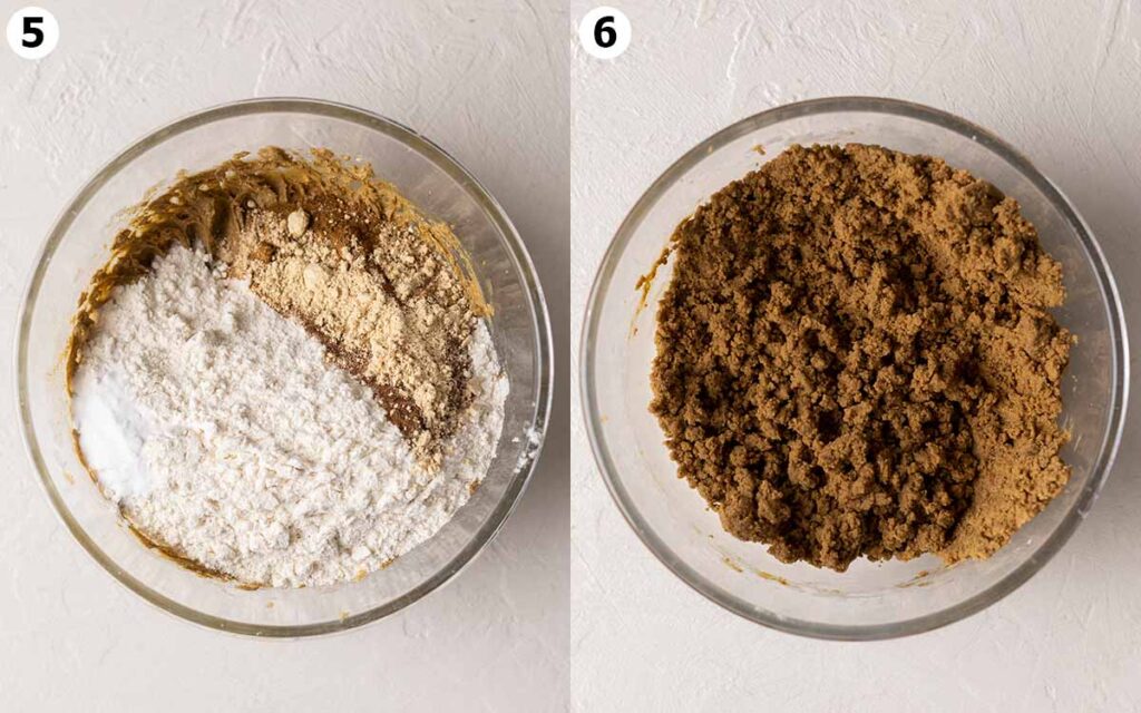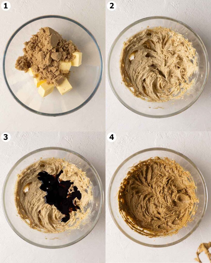 U većoj zdjeli mikserom (ili ručno) kremasto izmiksaj veganski maslac i smeđi šećer dok smjesa ne postane svjetlija i pjenasta. - Dodaj mokre sastojke