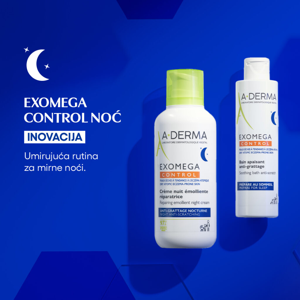 Osim noćne kreme, A-DERMA ima rješenje za potpunu rutinu prije spavanja, a koja je iznimno bitna kod pacijenata s atopijskim dermatitisom. U cilju umirenja kože i noćnog svrbeža, večernja rutina kože sklona atopiji uključuje primjenu Exomega Control umirujuće kupke protiv grebanja. Umirujuća kupka svojom nježnom formulacijom čisti kožu bez isušivanja i priprema je za noć. Ujedno, za razliku od ostalih proizvoda za higijenu kože, ova kupka se ne ispire. Redovita primjena Exomega Control umirujuće kupke pomaže u očuvanju vlažnosti kože i smanjenju iritacija, što je posebno važno tijekom zimskih mjeseci.